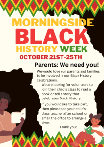 During the week, there will be a special Black History Month lunch and we will be learning about songs and music by Black composers and artists in our music lessons and assemblies. We would also like to invite parents and carers in to share books and stories in class. Please see the poster below.