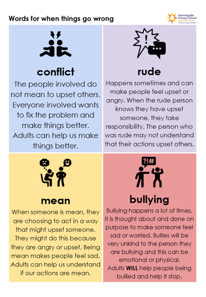 Next week as part of our assemblies we will be focusing on integrity and respect for others. We will be teaching the children useful vocabulary to support them asking adults for help when things go wrong. Please see the image below for a helpful description of the difference between conflict, being rude, being mean and bullying.