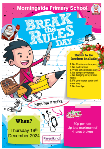 School breaks up for the Christmas holidays on Thursday 19th December at 1.30pm. There will be no after school clubs or play centres. We will also be having another Break the Rules Day.