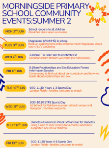 [/vc_column_text][vc_column_text el_class=”newsletter-events”]Monday 2nd June: School reopens for all children. Breakfast Club as usual.