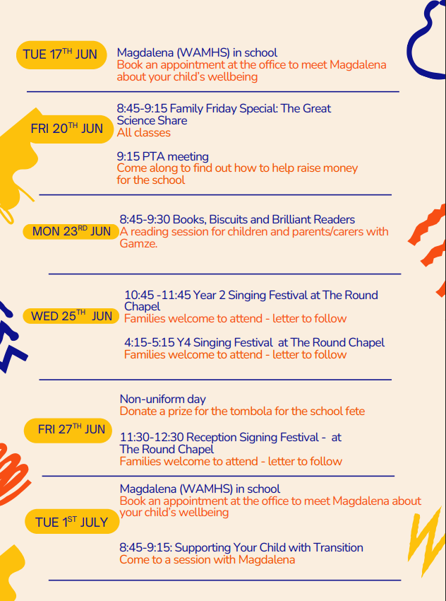 Tuesday 10th June: Years 1-3 Sports Day at London Fields 9:30-11:30am – families welcome