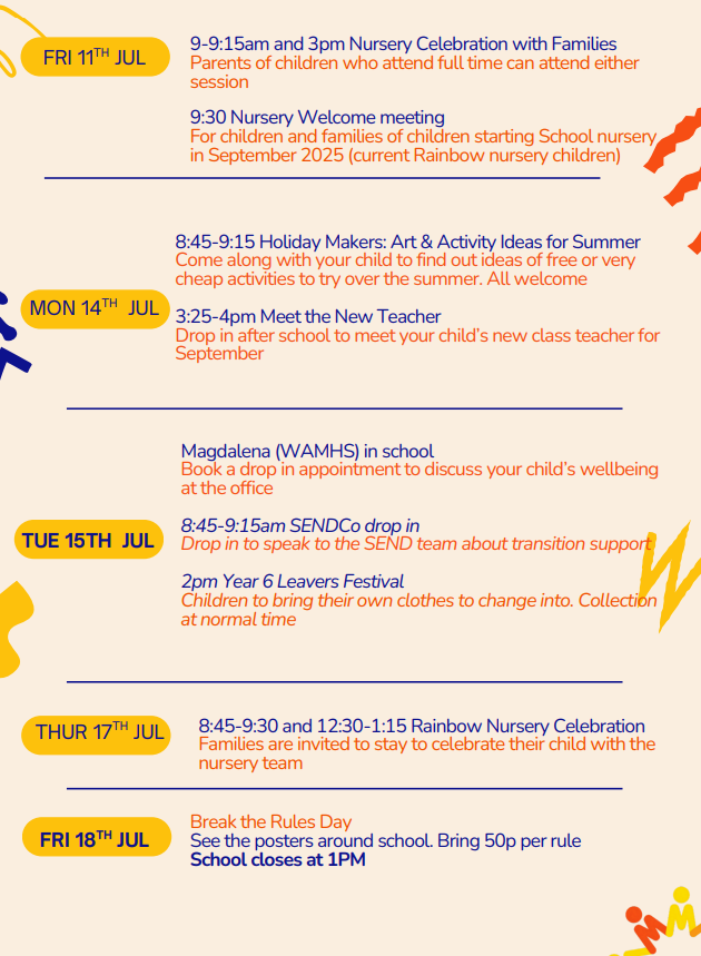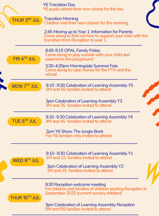 Thursday 10th July: Reception 2025 starters welcome meeting 9:30am